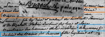 Hormis les curés Palauqui et Cauneille, on ne restera pas insensible au lieu de Marsa qui nous renvoie implacablement à Antoine Bigou qui a été à la tête de cette cure dès 1760 jusqu'en 1773 pour ensuite rejoindre son frère Jean à Rennes-le-Château. A n'en pas douter, celui-ci connaissait bien les familles Palauqui et Cauneille. Le père de François, Jean-Jacques Cauneille était très souvent témoin dans les actes rédigés par Antoine Bigou sur la paroisse de Marsa. S'il n'a pas baptisé François, à qui néanmoins il a dû faire le catéchisme, A. Bigou a baptisé, le 6 juin 1762, Marie-Cécile, une des jeunes sœurs du futur curé de Rennes-les-Bains. Il était suffisamment proche de cette famille pour venir assister au mariage d'une autre des sœurs Cauneille, Angélique avec Augustin Delmas, le 31 janvier 1786 :