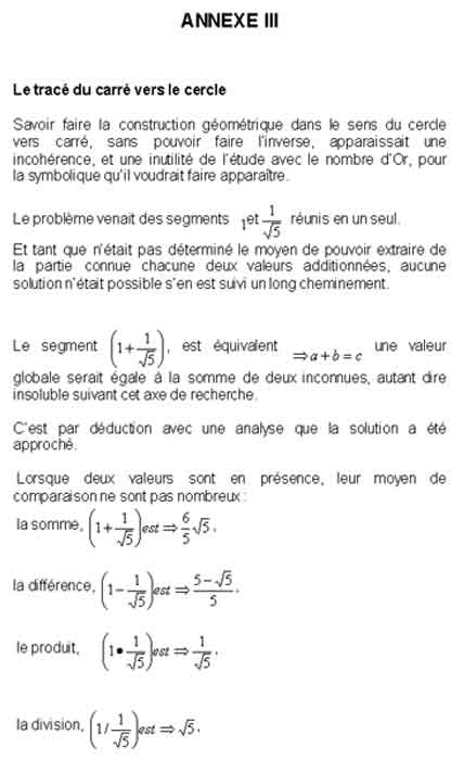 du cercle et du carré de même surface Introduction Cela a été signalé au début de l'exposé, la formule mathématique qui est utilisée pour l'équation approximative de Pi n'est pas issue d'un calcul pour recherche sur Pi, mais elle est une adaptation de la valeur connue du nombre Pi, suivant une tolérance pour l'exécution du tracé inférieure à 5 /1 000 000. La valeur 3,1415926535897932384626433832795 etc. . connue pour Pi, prise dans sa plus grande précision ne présente aucun intérêt de construction d'une représentation graphique. C'est donc la surface et non l'aire qui est l'objet de cet exposé. Si tant soit peu l'aire pourrait être à l'algèbre algébrique ce que la surface est à la géométrie Pour présenter un ordre de grandeur, l'erreur utilisée est comparable à une distance de 200 mètre, si était faite une mesure précise du périmètre de la terre. Nos anciens faisait il la différence ?, selon le dire de " PLATON " qui disait le détenir de prêtes Egyptiens, la quadrature du cercle serait inscrite dans la construction de certaines pyramides, qui contiendrait transcrite la somme des connaissance connues de ce temps. Le nombre d'Or à très largement été utilisé par les bâtisseurs de tous temps, à en croire PLATON, on ne pourrait mettre en doute l'image de Sagesse représentée par l'homme ou les hommes qui ont signé sous son nom ; il était dés lors, une hypothèse selon laquelle il pourrait exister une relation entre le nombres d'Or et la " quadrature du cercle des " géomètres". La valeur connue du nombre d'Or est 1,618 ; or ce nombre possède une particularité : multiplié par lui même, c'est comme s'il avait augmenté d'une unité. L'équation prend la forme : x2 = x + 1